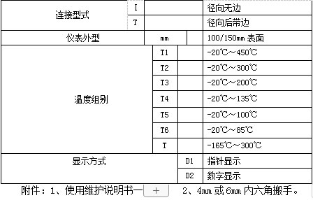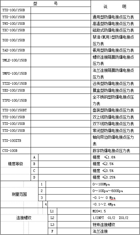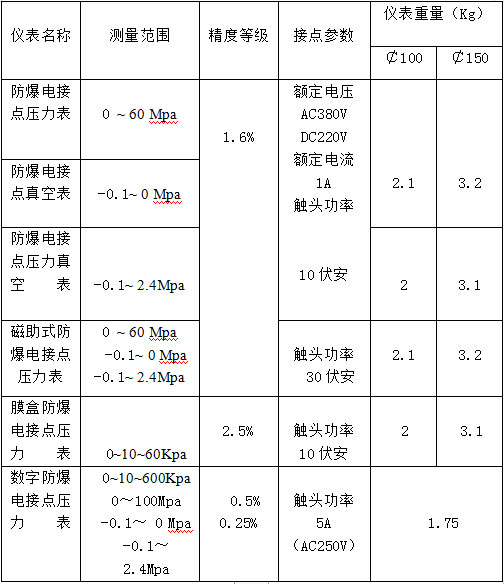 注:測量有腐蝕性、結(jié)晶與凝固性介質(zhì)時(shí),需采用耐酸、防腐或隔膜防爆電接點(diǎn)壓力表,測量微小壓力(10Kpa ~ 60Kpa),需采用膜盒防爆電接點(diǎn)壓力表,測量有震動(dòng)的場合請(qǐng)選用磁助式防爆電接點(diǎn)壓力表,要求測量精度高有震動(dòng)的場合采用數(shù)字防爆電接點(diǎn)壓力表,。