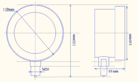 儀表使用干式陶瓷壓力傳感器,對安裝的角度無要求。儀表壓力導入口使用M20的外羅紋和壓力容器相連接,也可定制其他類型的連接接口。儀表外型尺寸見其它章節。